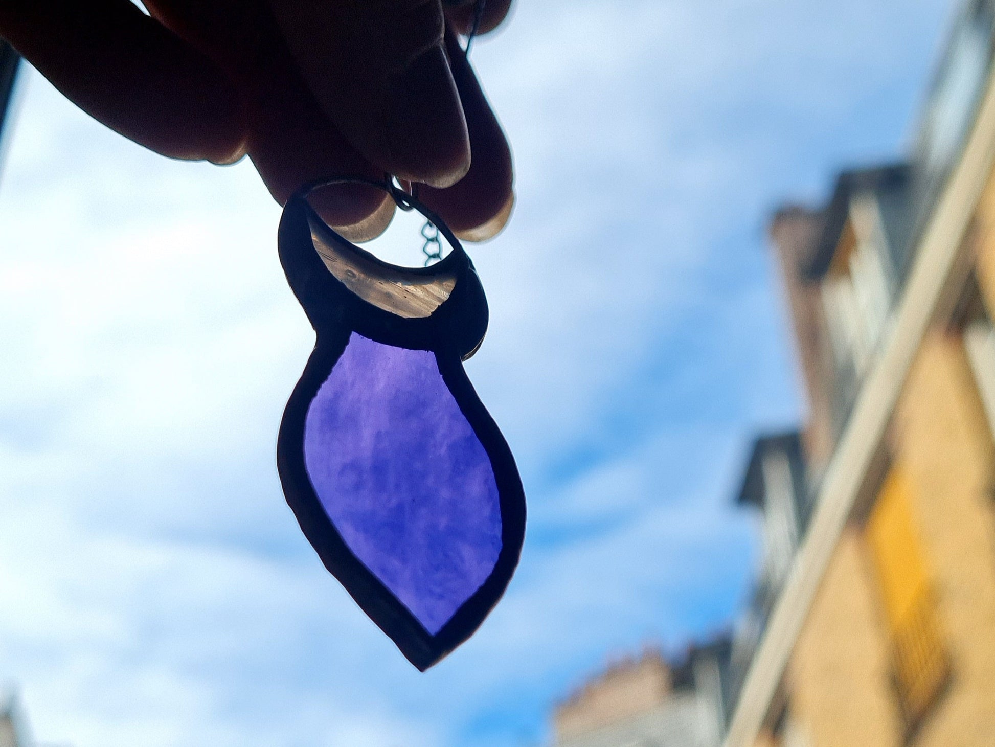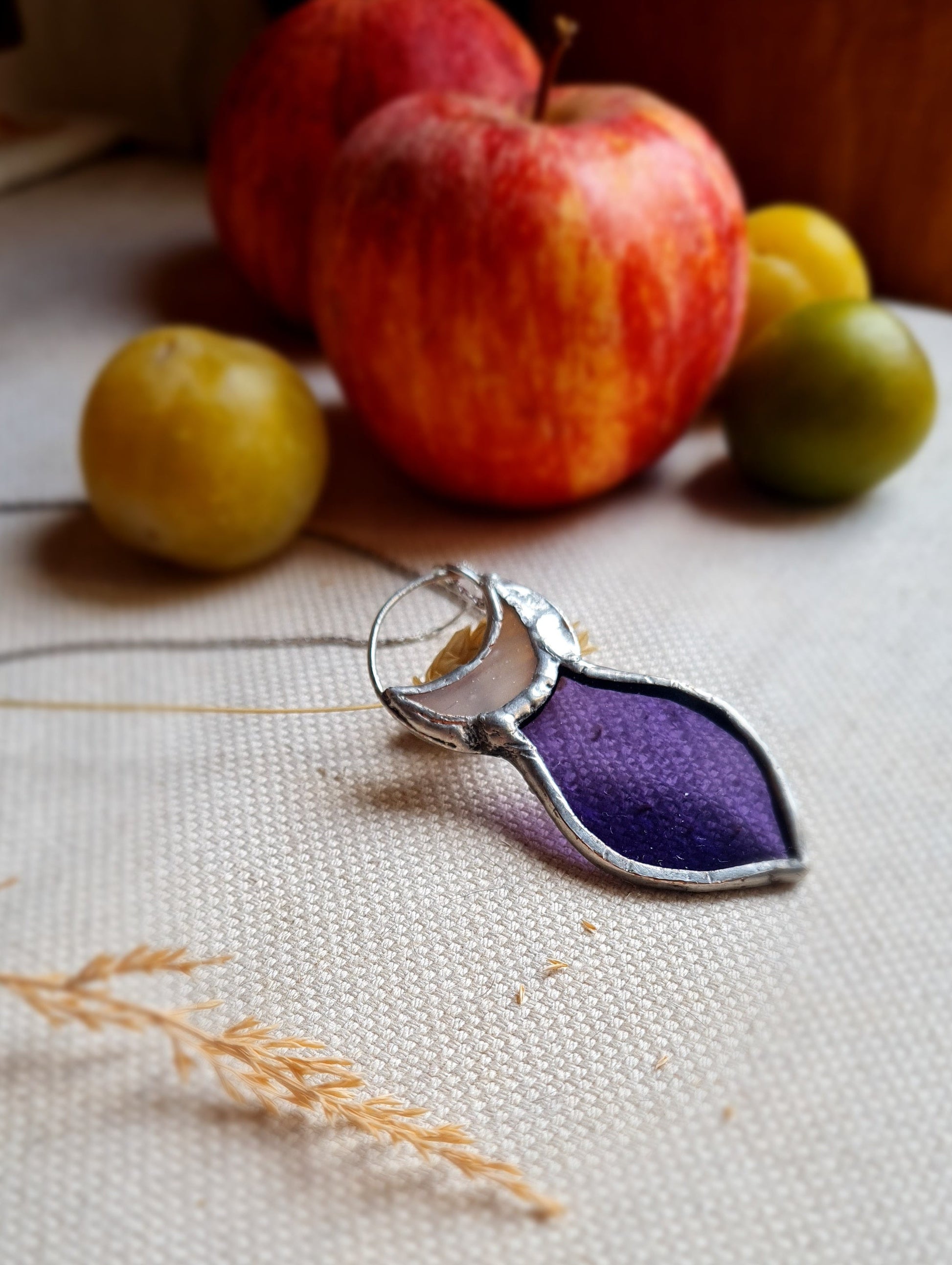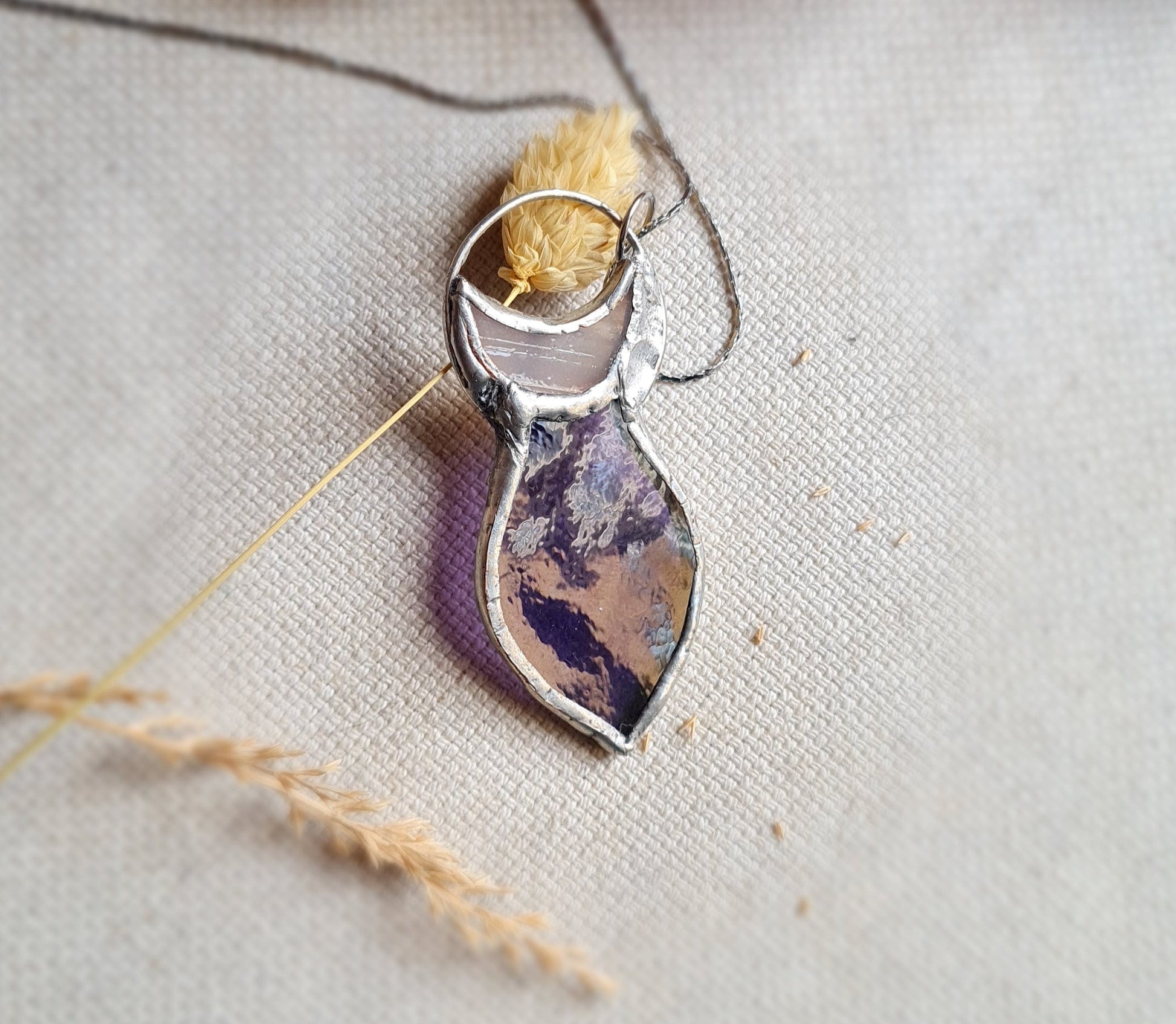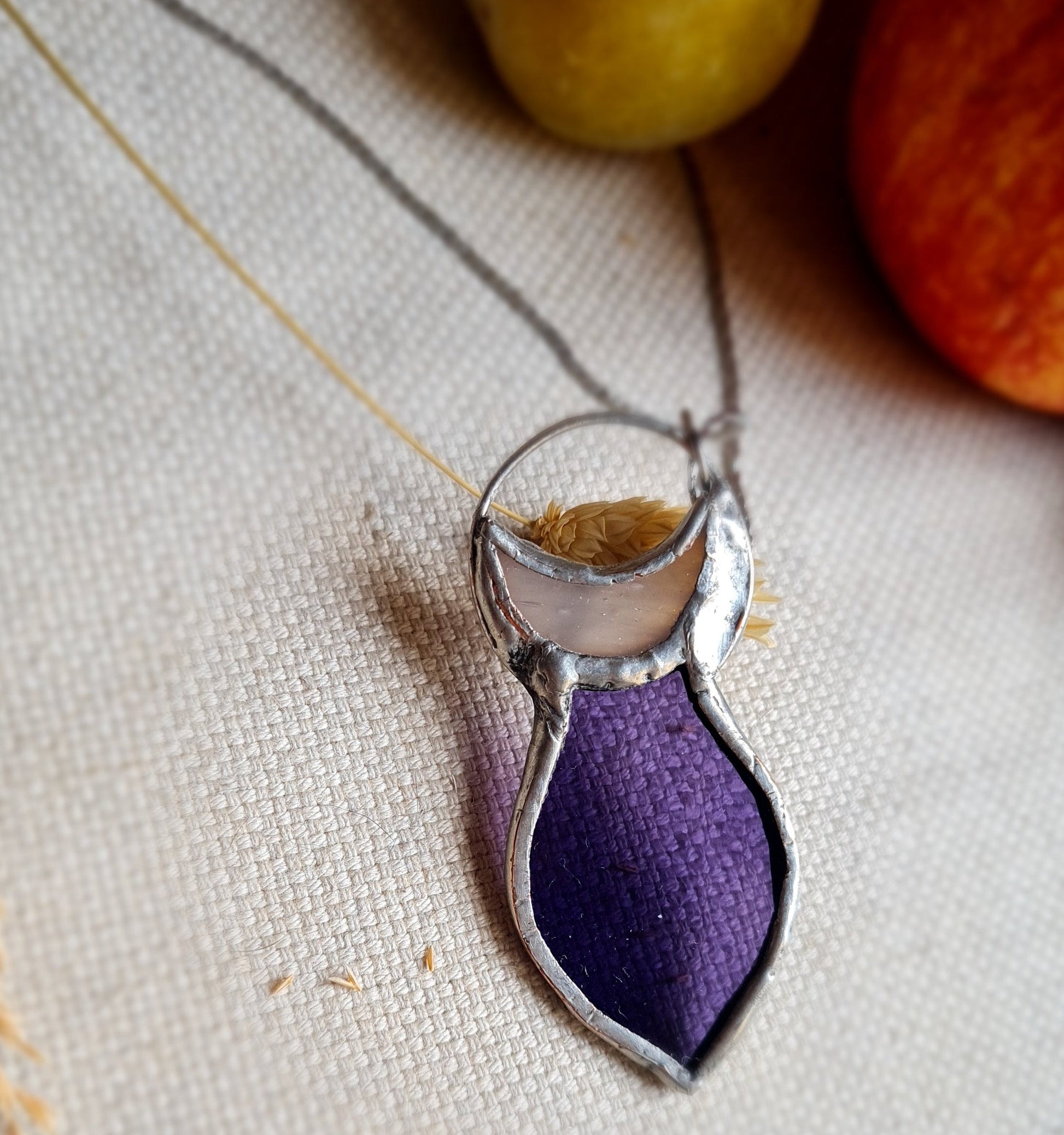 🌙 Ce pendentif est réalisé en verres violet profond et blanc lunaire. Il représente une fiole de potion à tête de lune inversée, avec un effet métal vieilli, forgé à la mode viking. L'étain est sans plomb et la chaîne fine argentée est montée sur un fil d'argent modelé à la main. ⚒️🧝🏻♀️