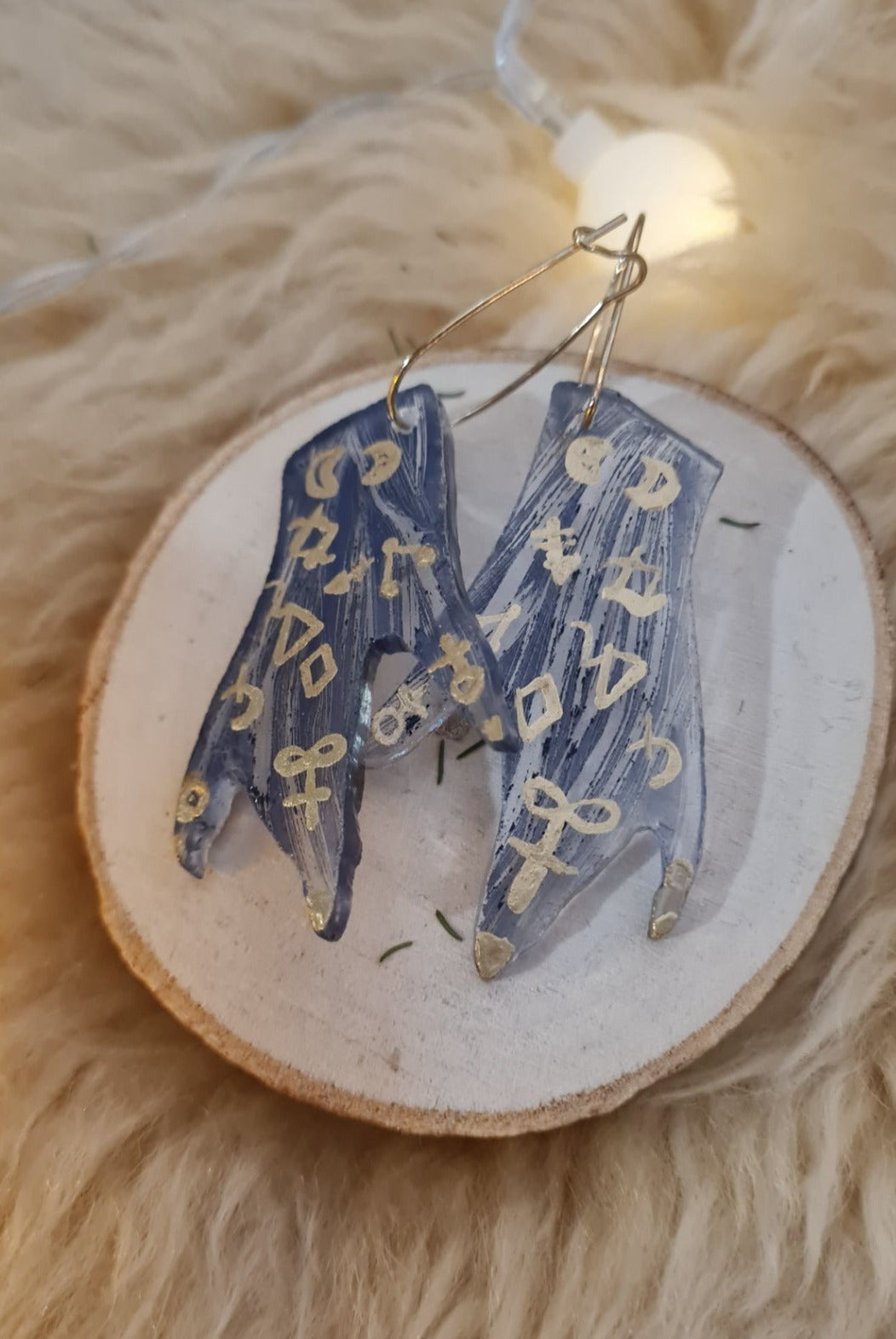 Ces deux paires de boucles d'oreilles sont réalisées entièrement à la main. Elles sont en verre, peintes à la grisaille traditionnelle cuite bleu-gris  et pour les mains de l'alchimiste, à la peinture dorée ajoutée à froid (ce sont des symboles alchimiques).